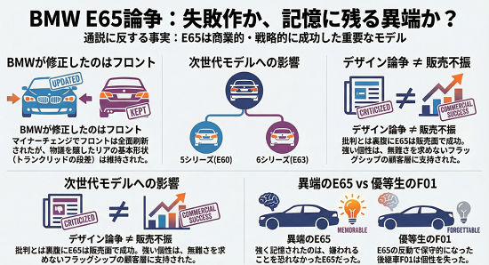 その結果、議論は単純化され、「E65=失敗したリヤデザイン」という物語が後年に固定化されていきます。