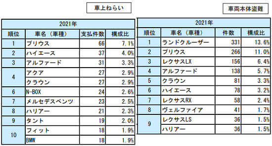 盗難比率の高い、トヨタランドクルーザー、プリウス、レクサスLX/RX、アルファードです。年式により差があるかと思えば、最新アルファード(2023年モデル)が盗まれるニュースも流れています。