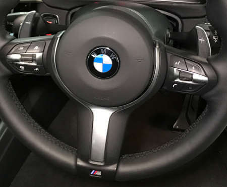 - Mスポーツのロゴがハンドルやドアシルパネルに記載されている。