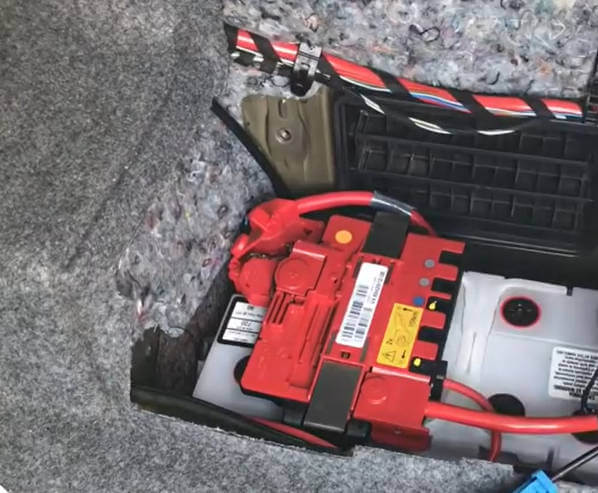 BMWは、前後の重量バランスの適正化から重量物となるバッテリーをトランク内のカバー下に格納しています。