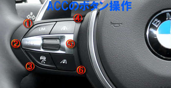 1. ACCのボタンをONにします。ステアリング左側の外側の列の一番下のボタンです。クルマの後ろ姿の絵にスピードメータのようなものがかぶさっている形のアイコンが書いてあります。