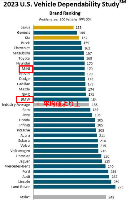 調査機関の米国JDパワー社が実施している「自動車の信頼性ランキング」です。