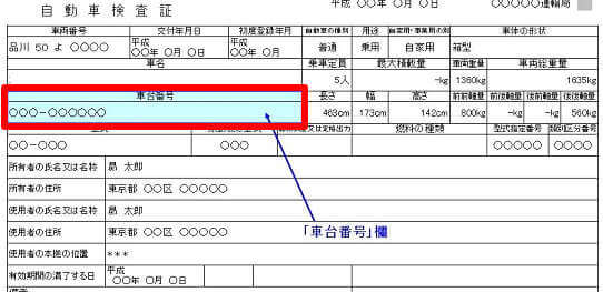 自動車検査証(車検証)の車台番号記載場所をメモしてください。