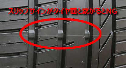 タイヤ側面の三角マークでスリップサインの位置を確認し、タイヤ面上のスリップサインがタイヤ面と繋がる(真っ平)とタイヤ寿命・交換時期です。