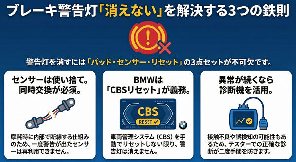 逆に言えば、パッド交換時に「センサー交換+リセット」まで含めて作業すれば、ほぼトラブルは防げます。