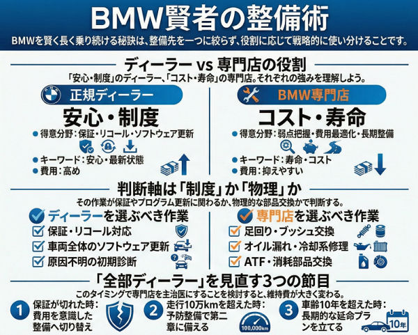 BMWの整備で最も大切なのは、「どこで直すか」ではなく「どう使い分けるか」です。