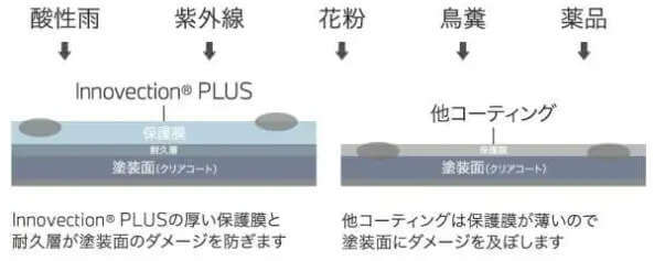 従来の製便名は「Innovection」でしたが、新開発の無機化合物と有機質のポリマーを独自に融合することにより、より耐久性を向上させたコーティングとなっています。